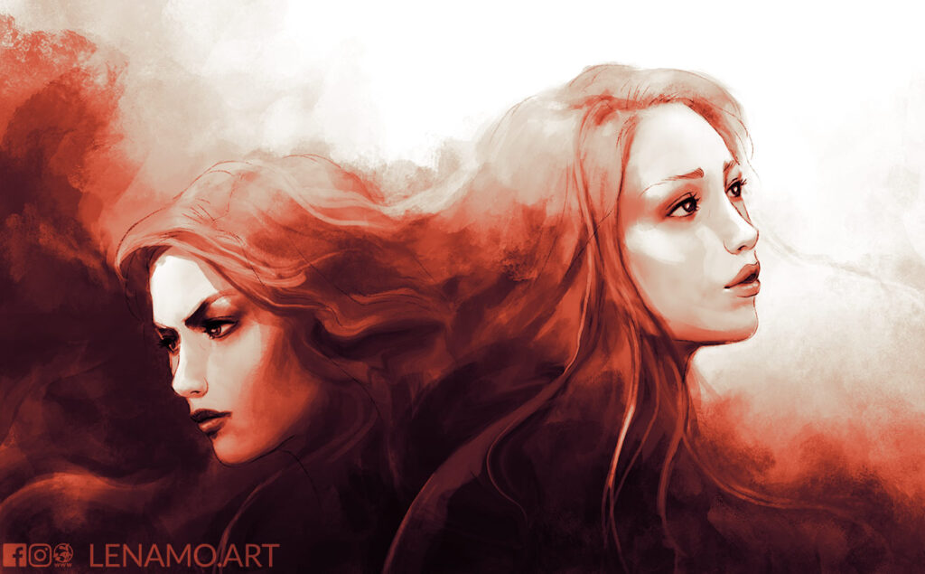 Fantastic start! But, it wasn’t totally my vision. It took a while, and a lot of back and forth. Make it redder. Close her eyes. Put a flaming effect off her eyes on the left. Put fire sparks in the background. Make her look more serene than sad. And many more changes. But finally we ended up with this: