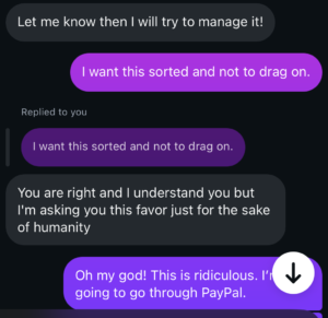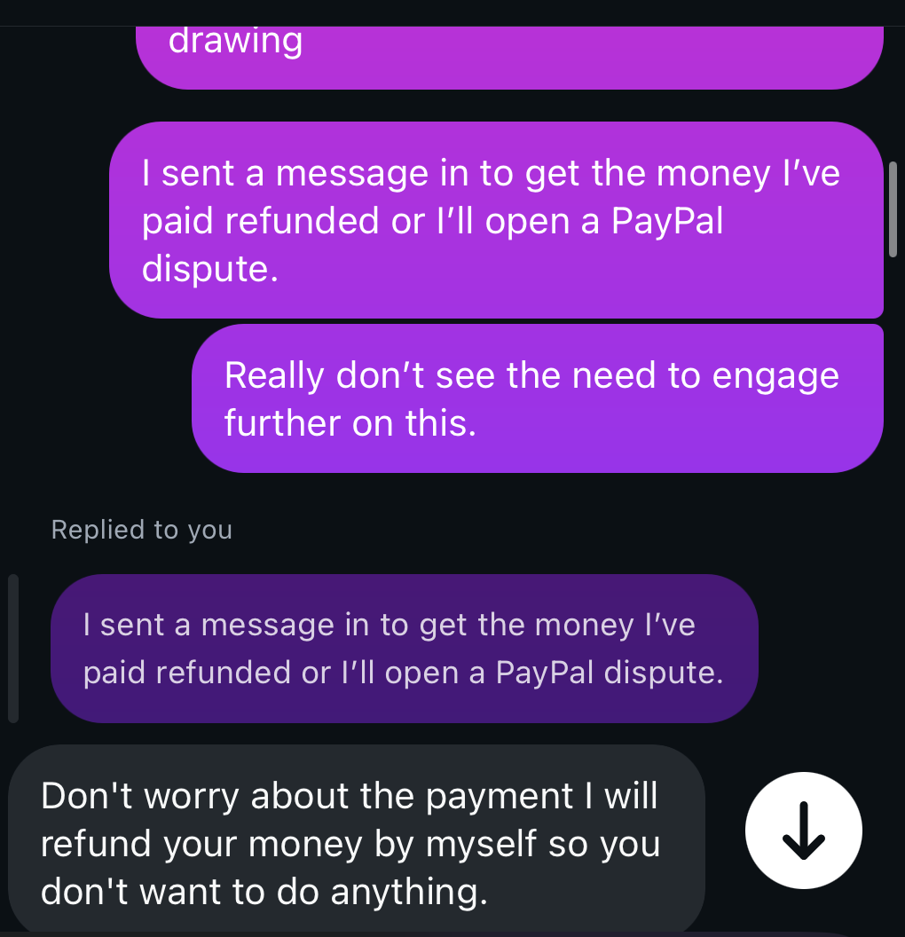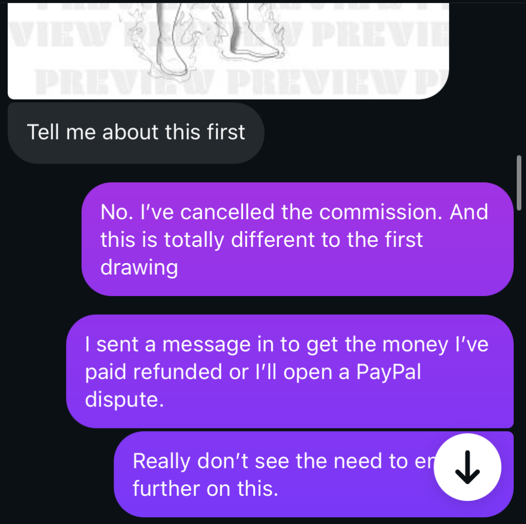 Here’s a brief snip of the conversation after I asked to cancel the commission and be refunded: