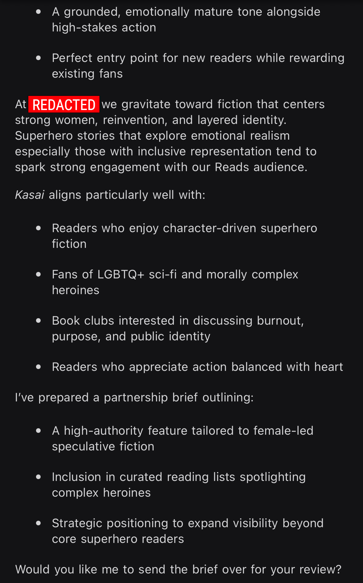 - Would you like any help marketing your book to my bazillion followers, for a cost of course.